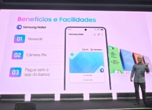 Um dos grandes anúncios do evento foi a expansão do pagamento por Pix na Samsung Wallet. A partir desta sexta-feira (17) até o dia 22 de abril, uma atualização massiva levará a funcionalidade de Pix por aproximação para mais de 100 modelos de smartphones da marca. A novidade permite que o usuário realize pagamentos diretamente na maquininha ou aponte a câmera para um código QR sem precisar abrir, ou até mesmo ter instalado, o aplicativo do banco no aparelho. O processo é centralizado na carteira digital e validado por biometria, garantindo que a transação seja rápida e segura, mantendo ainda o acúmulo de pontos no programa Samsung Rewards.