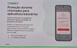 “Trata-se de um programa piloto para ajudar os brasileiros a se protegerem de golpes”, disse ela. Na prática, se o usuário abrir um app bancário enquanto estiver compartilhando a tela com um contato desconhecido, o Android exibirá um aviso e oferecerá a opção de encerrar a chamada com um toque. O projeto piloto já conta com a parceria do Itaú.