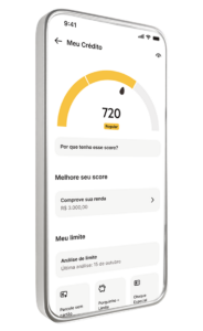 Ao acessar o “Meu Crédito”, o usuário encontra a visualização do seu Score de Crédito com sugestões de evolução e uma área para atualização de renda.