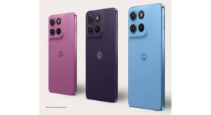 O modelo conta com tela Full HD+ de 6,7 polegadas e 1.000 nits de brilho, garantindo boa visibilidade sob o sol. O design inclui acabamento em Vegan Leather e proteção IP64 contra poeira e respingos. Cores exclusivas da curadoria Pantone, como Roxo, Azul Claro e Rosa, completam o visual.