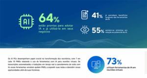Para enfrentar esse desafio, 46% das PMEs globais consideram a IA “extremamente importante” para competir com as grandes corporações e 36% a veem da mesma forma em relação a startups. Os principais benefícios citados para a adoção dos AI PCs (computadores com IA embarcada) são o aumento da produtividade e eficiência (68%) e a capacidade superior de análise de dados e insights (64%).