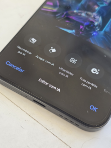A inteligência artificial vai além dos comandos de voz e oferece diferentes opções de edição. Mexendo na galeria, me senti com um estúdio de bolso. O editor oferece recursos para apagar elementos indesejados, remover reflexos de vidros — o que é ótimo para fotos em janelas de avião ou vitrines — e até deixar imagens mais nítidas. Tem também a opção de melhorar a paisagem automaticamente. É o tipo de recurso que, depois que você acostuma a usar para salvar aquela foto que ficou quase perfeita, fica difícil voltar para um celular que não tem.