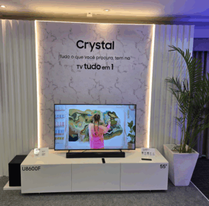 Na base do portfólio, mas responsável por gerar volume de vendas, está a linha Crystal (modelos U8600F e U8100F). A Samsung mantém a estratégia “Tudo em Um” para estes modelos 4K convencionais. Apesar de serem a entrada da marca, elas oferecem o Samsung Gaming Hub (para jogos na nuvem sem console), canais gratuitos via Samsung TV Plus e a garantia de sete anos de atualizações do sistema operacional Tizen, além do controle por smart watch e modo Karaokê.
