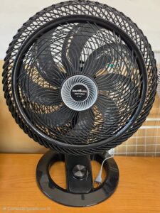 Um ponto que me deixou tranquila foi saber que o motor possui um fusível térmico de segurança. Se ele esquentar demais por algum motivo, desliga sozinho para evitar acidentes. E apesar dessa força toda, ele tem classificação energética A, ou seja, não vai ser o vilão da sua conta de luz no fim do mês. A grade também é removível, o que facilita a limpeza das oito pás, que por sinal acumulam poeira como qualquer outro ventilador.