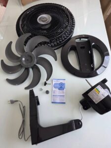 Já vou avisando que a montagem é o principal ponto de atenção desse modelo. Não que seja um quebra-cabeça impossível, mas é uma etapa minuciosa e que exige paciência. Ele é um modelo 2 em 1, feito para mesa ou parede, e pesa cerca de 5,8 kg. Recomendo fortemente que você faça a montagem em dupla. O motor é robusto e pesado, e na hora de fixar a grade traseira, você precisa encarar quatro parafusos que exigem um certo jeito para alinhar perfeitamente.